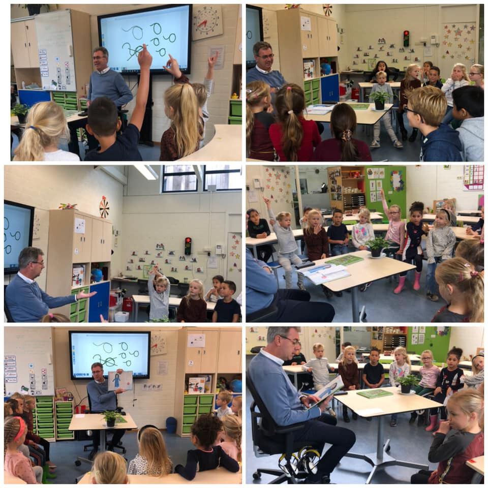 De Aventurijn had een speciale gast vandaag. In het kader van de dag van de duurzaamheid kwam gedeputeerde Harry van der Maas voorlezen in groep 3a en 6b. De kinderen hadden ook wat vragen voorbereid. Wat doet u aan duurzaamheid? Niet alles ging over duurzaamheid. Want groep 3 vroeg zich af of hij de koning al eens had ontmoet?