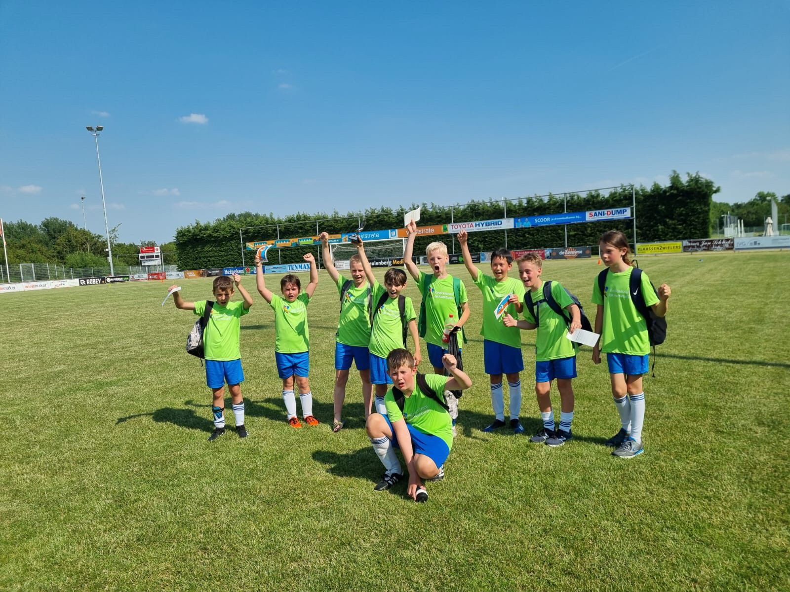 Op woensdag 16 juni mochten de jongens uit de groepen 7 en 8 het spits afbijten met het schoolvoetbaltoernooi. In de nieuwe sporttenues gingen ze met twee teams op pad. Het was een hele warme dag. Met veel water drinken en insmeren tussendoor, hebben de jongens ontzettend sportief gevoetbald. Team 2 heeft zelfs de derde prijs gewonnen!
